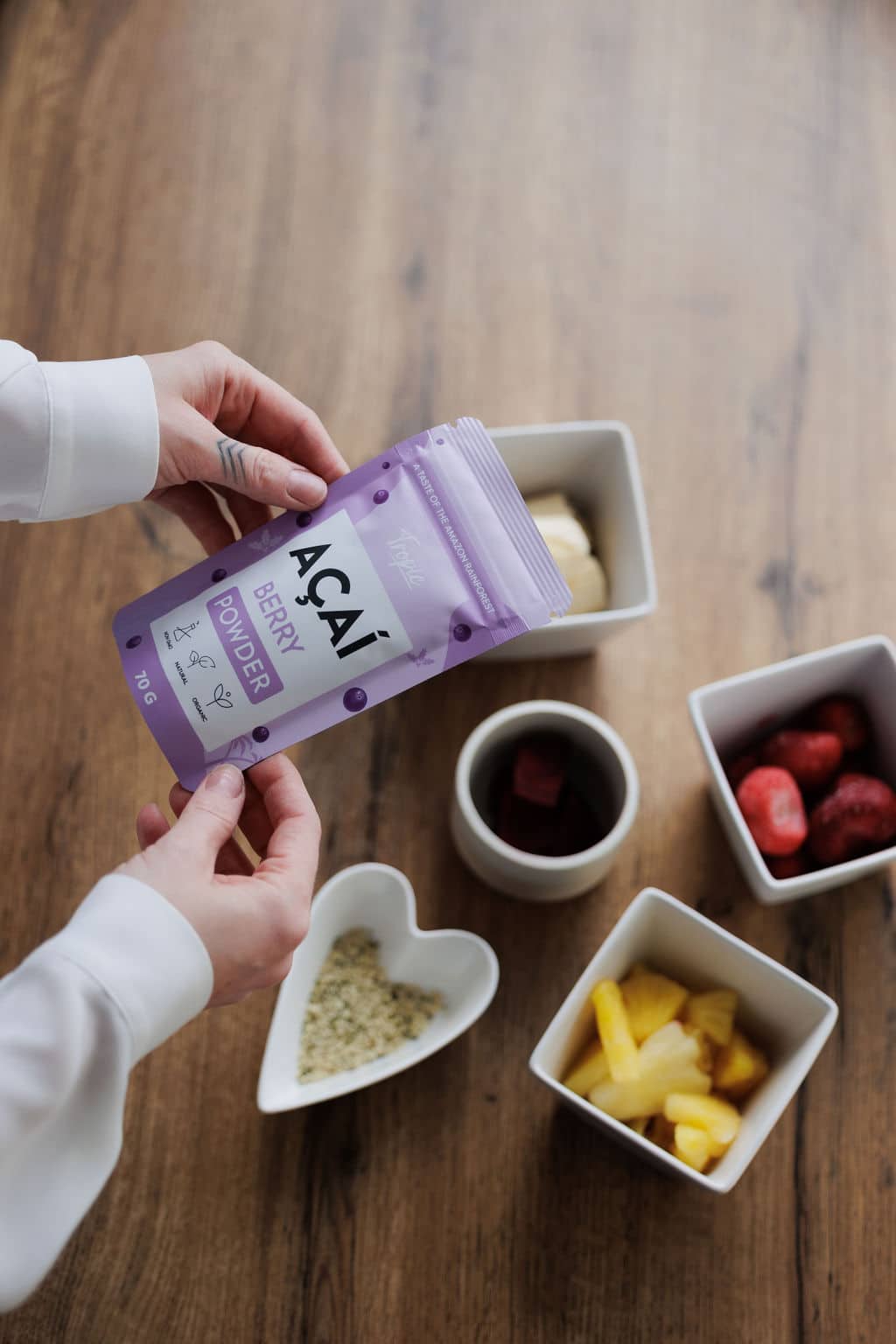 Duftið er fíngert og hentar vel í þeyting, chia graut eða jógúrtina fyrir aukin vítamín og steinefni. Það sem er í uppáhaldi hjá Tropic teyminu eru acaí skálar.